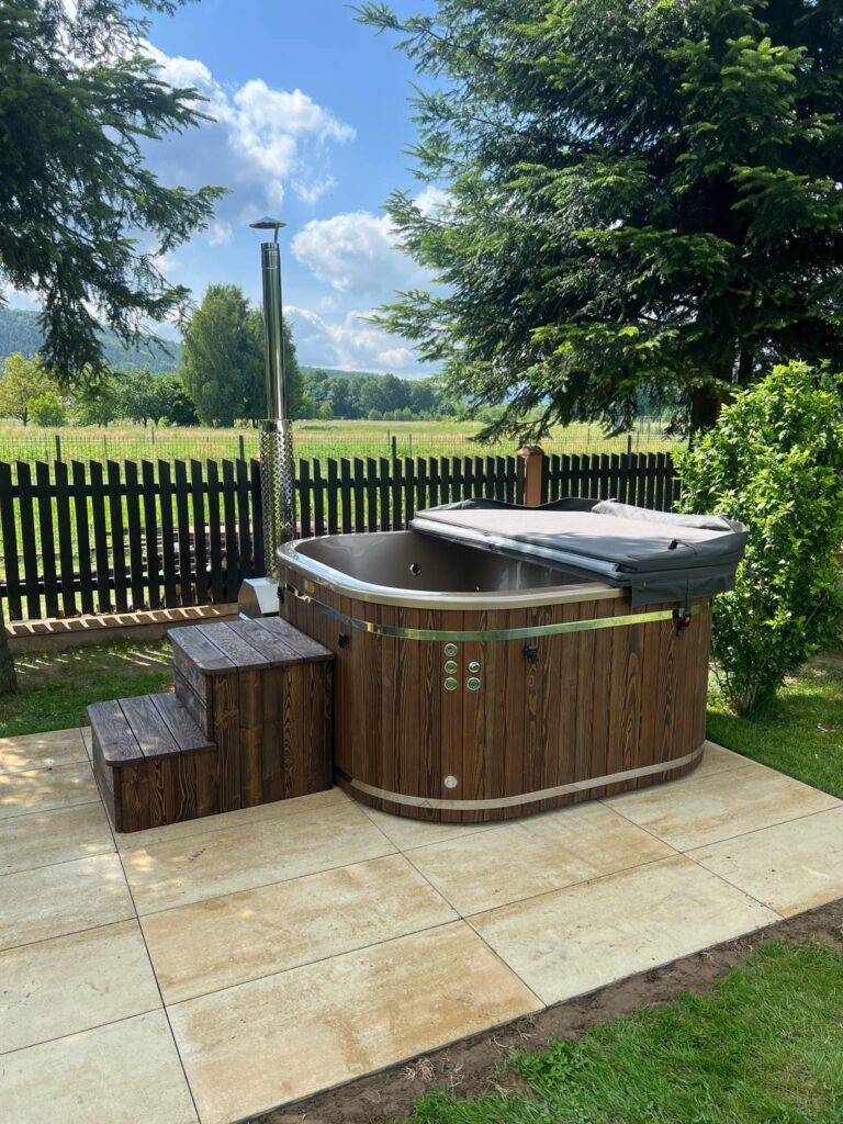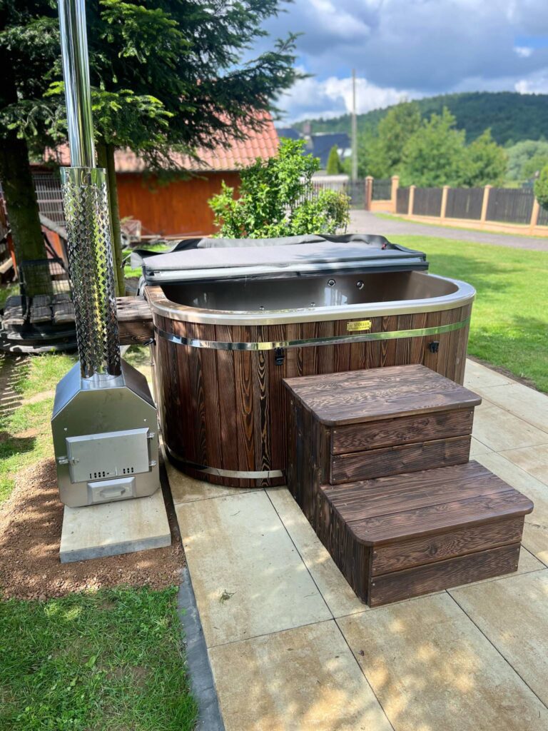 Balia ogrodowa standard kwadratowa to balia z piecem zewnętrznym. Ten model pomieści 5-6 osób
